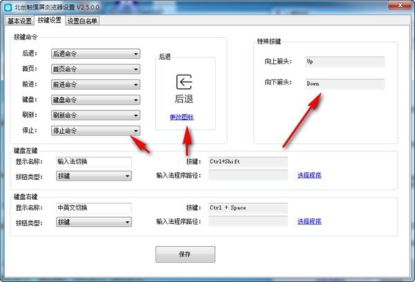 3.按鍵設(shè)置頁面可以對按鍵命令和特殊按鍵以及快捷鍵和輸入法切換進(jìn)行設(shè)置,同時可以設(shè)置按鍵命令圖標(biāo)。
