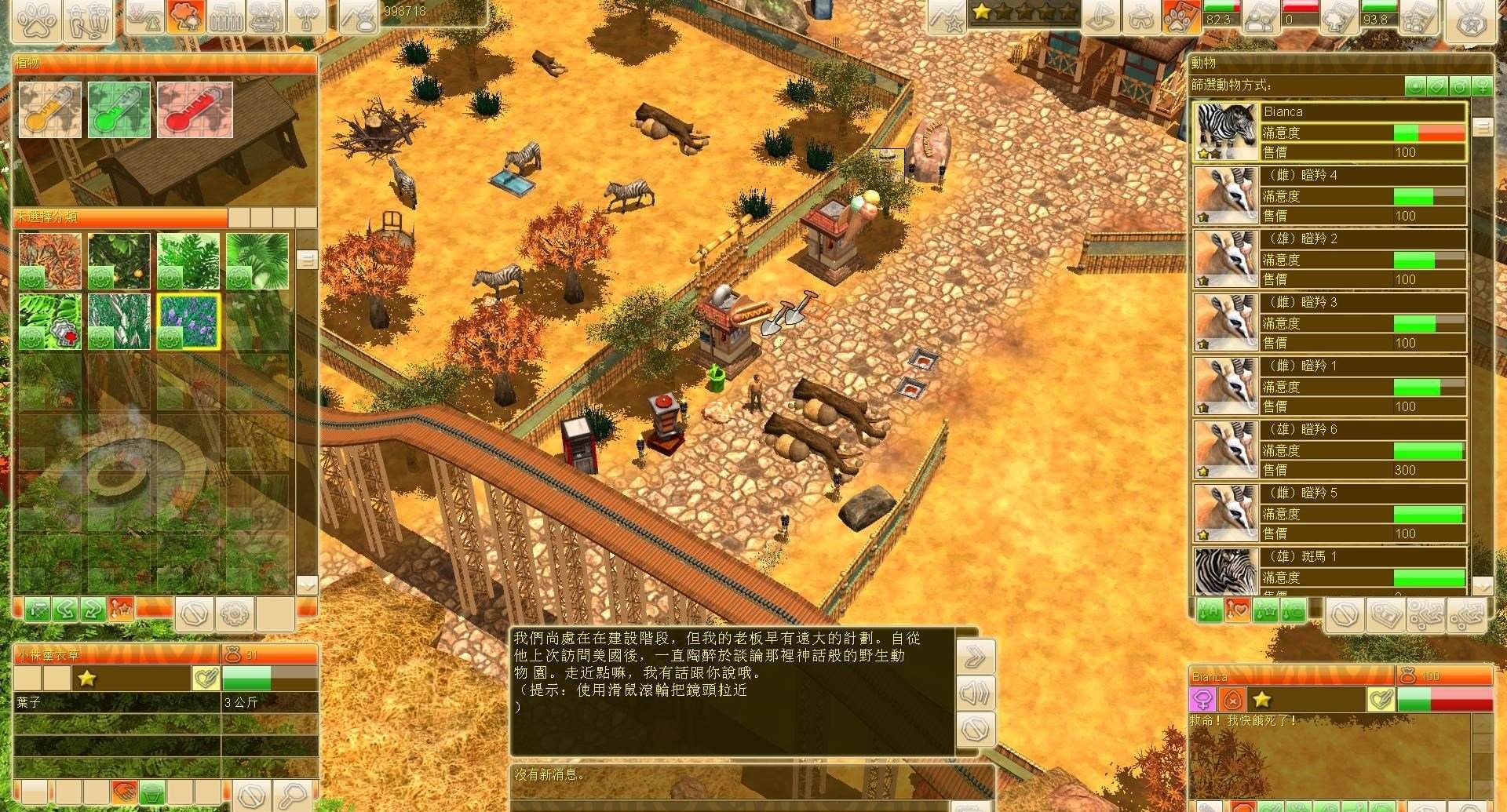 第二個按鈕是“植物”按鈕,這里可以在動物園中種植各種植物,包括樹木和花卉,有些是為了美化環(huán)境讓游客滿意,有些則是為了讓動物滿意。游戲中的植物比較多,并且對應不同的氣候,有適中氣候、熱帶氣候以及沙漠氣候三種,適中氣候的植物有樺樹、橡樹、柳樹、楊樹、松樹(兩種形態(tài))、高松、美洲杉、刺柏屬叢木、黃楊屬、歐洲花楸、銀矮柏、金鐘柏、月桂樹、杜鵑花、蘆葦、石楠屬植物、花壇(兩種形態(tài));熱帶氣候的植物有桉樹、杏樹、中國風車棕櫚、香蕉棕櫚、海棗、絲蘭、旅人棕櫚、無花果樹、竹子、露兜樹屬植物、椰子樹、紅樹林、雨樹、火樹、大果肉桂、蕨類植物、水瓶棕櫚、巴豆、擎天鳳梨屬、花壇(三種形態(tài));沙漠氣候的植物有樹形仙人掌、祈禱樹、雨傘荊棘、面包樹、龍血樹、龍舌蘭屬植物、奧根派普仙人掌、仙人掌叢(三種形態(tài))。選擇植物之后右邊的窗口中會出現(xiàn)該植物對水源的需求以及對游客的吸引力,玩家需要判斷最適合自己的動物園的植物進行種植。