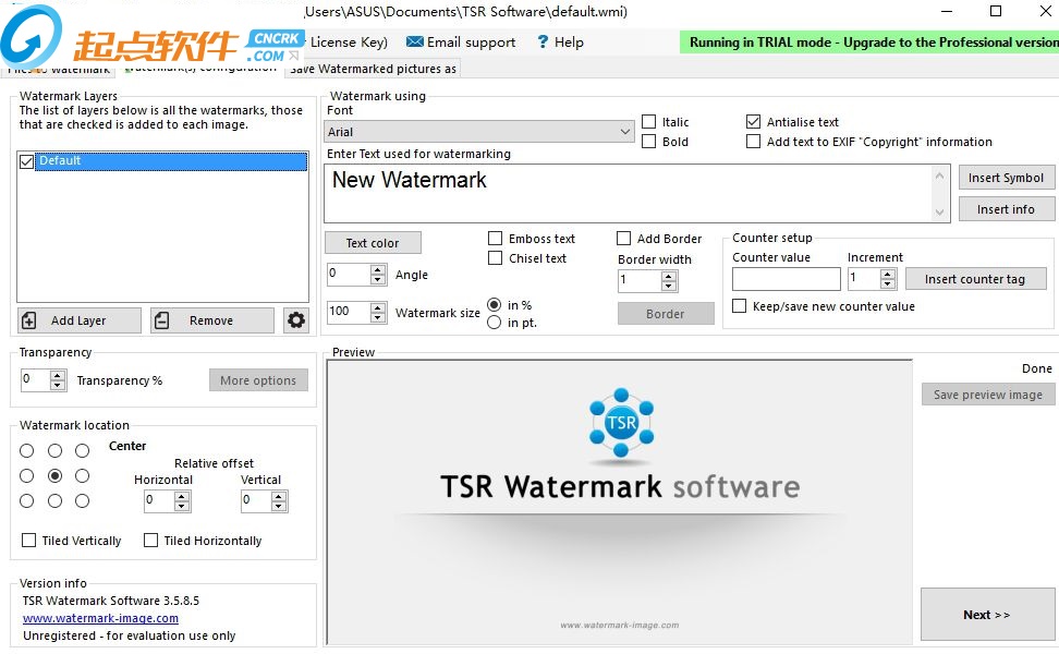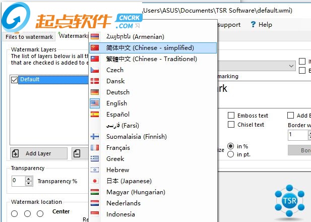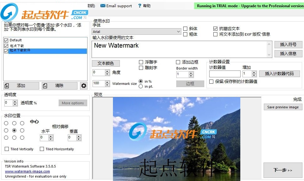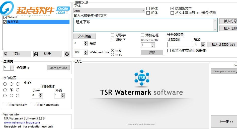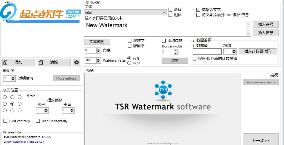 tsr watermark image破解版是一款功能強(qiáng)大的輕量級(jí)水印制作軟件。tsr watermark image中文版集水印管理、水印參數(shù)配置、日志管理等功能于一體,提供強(qiáng)大的水印制作添加服務(wù),不僅可以將文字、圖片等作為水印來源,還可以進(jìn)行透明度設(shè)置、批量操作等,并支持JPEG,TIFF,PNG,BMP和gif等文件格式。