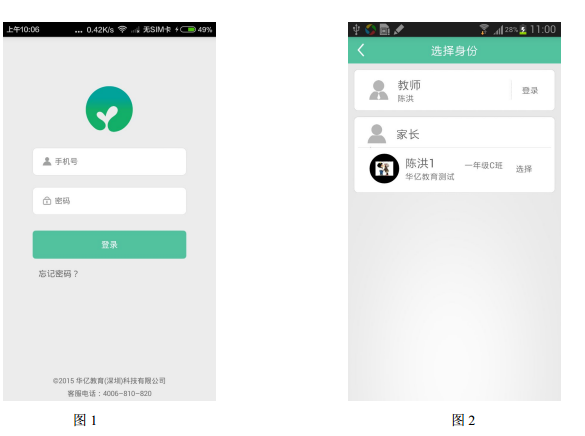 請使用已經(jīng)在后臺(tái)系統(tǒng)注冊過的賬號和密碼進(jìn)行登錄。如圖1操作:如果提示“密碼錯(cuò)誤!”,請輸入正確密碼或點(diǎn)擊“忘記密碼”來重新設(shè)置密碼;如果提示“該帳號沒有注冊”,請確認(rèn)輸入的帳號是否正確,如確定帳號無誤請聯(lián)系學(xué)校相關(guān)負(fù)責(zé)人或者直接聯(lián)系客服熱線4006-810-820。如果用戶帳號既是老師又是家長,則登錄的時(shí)候會(huì)提示選擇登錄身份。