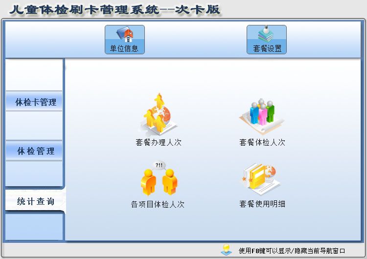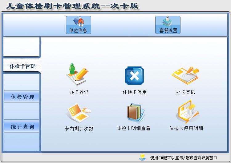 《兒童體檢刷卡管理系統(tǒng)--次卡版》是一款專為醫(yī)院體檢刷卡開發(fā)的一款管理軟件,兒童或新生兒出生體檢辦理套餐,通過每一次的體檢項目刷卡扣套餐次數(shù)。軟件集辦卡、體檢、管理套餐等功能與一體,您可隨時查詢統(tǒng)計卡內剩余次數(shù)、套餐辦理情況、各項目體檢情況。軟件界面設計簡潔、美觀其人性化的管理可以使用戶輕易上手,大大節(jié)省工作時間,提高工作效率??茖W的管理方法會給您帶來無限的效益,該軟件將是您明智的選擇。 《兒童體檢刷卡管理系統(tǒng)--次卡版》包含如下功能: 基本信息:單位信息、套餐設置。 體檢卡管理:辦卡登記、體檢卡停用、補卡登記、卡內剩余次數(shù)、體檢卡明細查看、體檢卡停用明細。 體檢管理:刷卡體檢、今日體檢明細。 統(tǒng)計查詢:套餐辦理人次、套餐體檢人次、各項目體檢人次、套餐使用明細。
