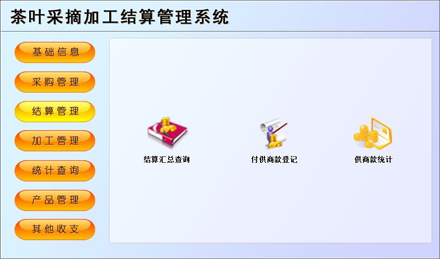 三、結(jié)算管理:結(jié)算匯總查詢、付供商款登記、供商款統(tǒng)計(jì)、績效工資登記、績效工資統(tǒng)計(jì)