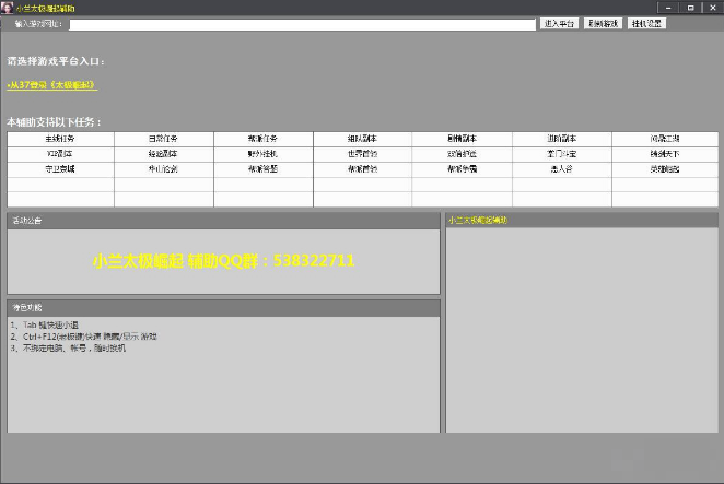 1、打開輔助主程序“小蘭太極崛起輔助.exe”,然后在主界面上填寫你的游戲賬號和密碼,平臺和區(qū)服并點擊添加,然后雙擊進游戲。3、進游戲后點擊輔助右上角的【掛機設置】按鈕,勾選需要執(zhí)行的任務或者活動,BOSS默認從上往下打,順序可以隨意調節(jié)。
