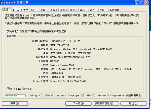 開始-運(yùn)行-輸入dxdiag,確認(rèn)。在彈出的對話框中可以看到系統(tǒng)的DirectX版本(非硬件)