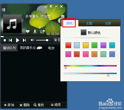 彈出的對(duì)話框中,我們選擇“顏色”,我們可以點(diǎn)擊下面的顏色來給多米音樂盒設(shè)置皮膚