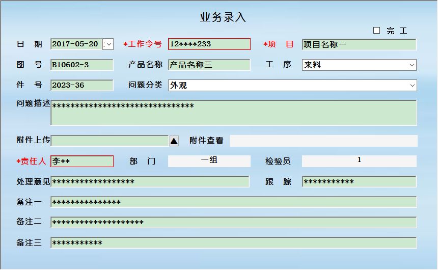 《質(zhì)控管理系統(tǒng)》是為了方便一些生產(chǎn)型企業(yè),對(duì)出現(xiàn)問(wèn)題的產(chǎn)品做進(jìn)一步處理,及在問(wèn)題環(huán)節(jié)中涉及到的責(zé)任人進(jìn)一步管理。 具體功能如下:基礎(chǔ)設(shè)置:工序設(shè)置、人員信息、項(xiàng)目信息和問(wèn)題設(shè)置。 信息管理:業(yè)務(wù)登記、部門問(wèn)題、責(zé)任人問(wèn)題、項(xiàng)目質(zhì)量問(wèn)題、產(chǎn)品質(zhì)量問(wèn)題、業(yè)務(wù)情況查詢及綜合統(tǒng)計(jì)表。 本軟件支持與excel文件導(dǎo)入導(dǎo)出數(shù)據(jù),支持圖片等一些文件作為附件上傳。本軟件界面設(shè)計(jì)簡(jiǎn)潔、美觀,操作簡(jiǎn)單、易學(xué)、易用。軟件如不適合您的要求,可以根據(jù)您的要求調(diào)整軟件或?qū)iT為您開(kāi)發(fā)。