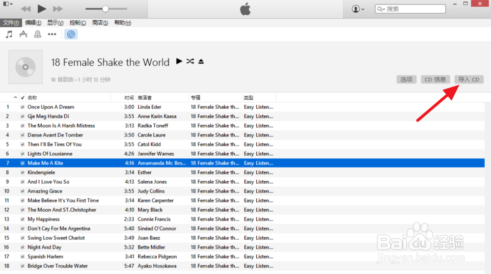 就會出現(xiàn)下面的頁面,這時候音樂還沒有導(dǎo)入iTunes資料庫,點擊右上方的【導(dǎo)入CD】