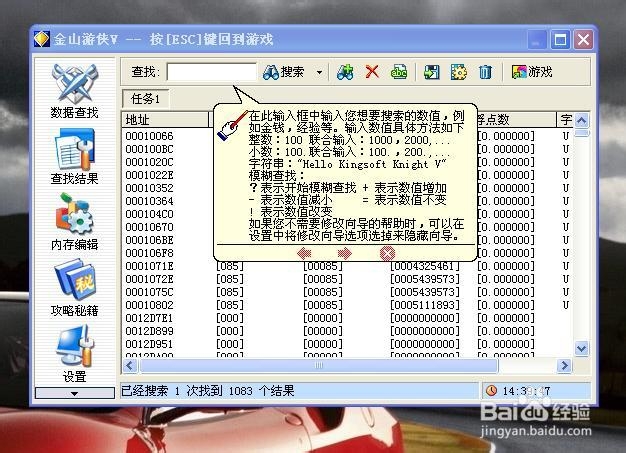 1.游俠的快速修改通過(guò)金山游俠V(金山游俠修改器)客戶端通常會(huì)感覺(jué)很過(guò)癮,當(dāng)你輸入要查詢的數(shù)值按下回車(chē)鍵后,在幾秒之內(nèi)就可以完成搜索過(guò)程。而且游俠查詢定位的準(zhǔn)確性也是很高的,當(dāng)?shù)诙屋斎霐?shù)值進(jìn)行查詢時(shí),基本上就可以排除其它的地址,找到準(zhǔn)確的地址以后,很快就可以使用戶完成對(duì)游戲的修改。該功能是游俠的主要特征之一。