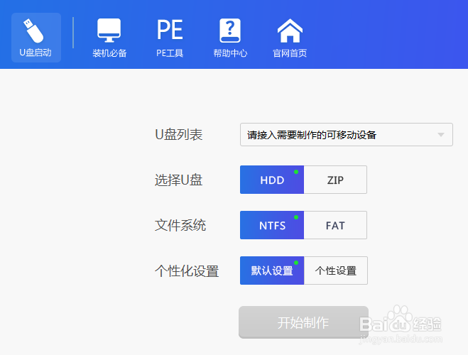 2、通過插入U(xiǎn)盤,接著選擇U盤,選擇文件系統(tǒng)和個(gè)性化設(shè)置,這里為工具默認(rèn)提供選項(xiàng),USB-HDD模式為硬盤仿真模式,此模式兼容性高,但對于一些只支持USB-ZIP模式的電腦則無法啟動(dòng),USB-ZIP,大容量軟盤仿真模式,此模式在一些比較老的電腦上是唯一可選的模式,但對大部分新電腦來說兼容性不好,特別是2GB以上的大容量U盤,建議2008年以前的電腦采用USB-ZIP模式,兼容性好,2008年以后的電腦采用USB-HDD模式,啟動(dòng)比較快。