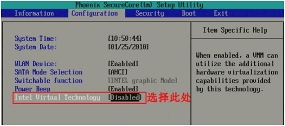 (1) 選擇Configuration選項(xiàng),選擇Intel Virtual Technology并回車。
