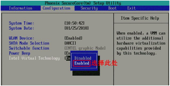 (3) 將該選項(xiàng)將變?yōu)镋nabled,再按F10鍵保存并退出BIOS,即可開啟VT功能。