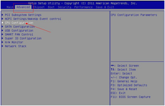 (1) 進(jìn)入BIOS,鍵盤的左右鍵選擇“advanced”界面,然后用上下鍵選中“CPU configuration”,Enter回車。