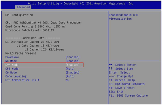 (2) 用上下鍵選中“SVM Mode”(全稱“secure virtual machine mode”),Enter回車,將“Disable”改成“Enable”即可,F(xiàn)10保存退出并重啟電腦。