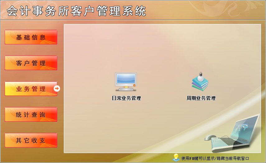 《會(huì)計(jì)事務(wù)所客戶管理系統(tǒng)》適用于中小型會(huì)計(jì)事務(wù)所管理客戶業(yè)務(wù)的軟件。主要包基本信息、客戶管理、業(yè)務(wù)管理、統(tǒng)計(jì)查詢、其它收支。本管理系統(tǒng)多處具有快速輔助錄入功能,操作簡(jiǎn)單,易學(xué)、易用;處理功能高效強(qiáng)大,是協(xié)助您的好幫手!