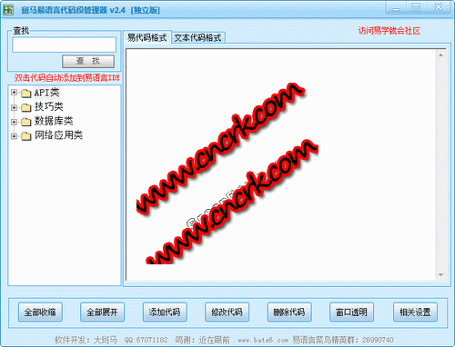 斑馬易語言代碼段管理器,是您學(xué)習(xí)易語言必不可少的一個(gè)工具,它使您的收藏代碼不在混亂,查找 分類 和雙擊就可將代碼發(fā)送到易語言代碼界面,都是一個(gè)很方便的工具。