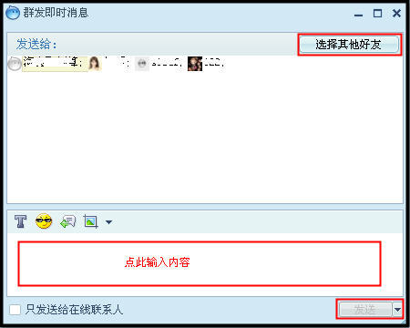 松開“Ctrl”鍵,在任意一個(gè)選中的聯(lián)系人上點(diǎn)擊鼠標(biāo)右鍵,選擇“給選定的用戶發(fā)送即時(shí)消息”,在彈出的框中輸入要發(fā)送的內(nèi)容,點(diǎn)擊“發(fā)送”按鈕即可,操作步驟同1: