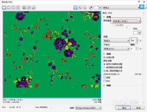 8.注意,為了顏色不改變,選擇24位RGB格式,把質量改為100%點擊確定。