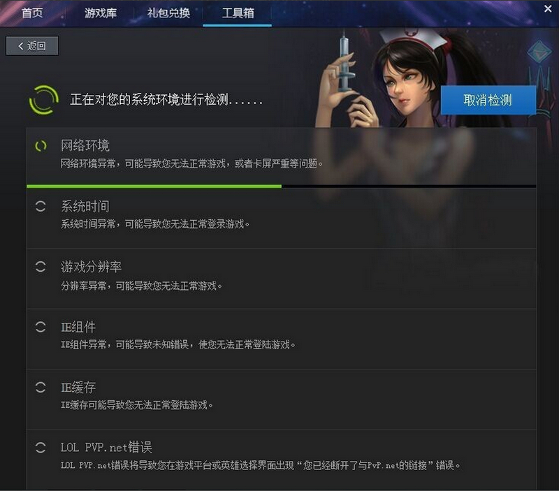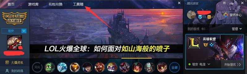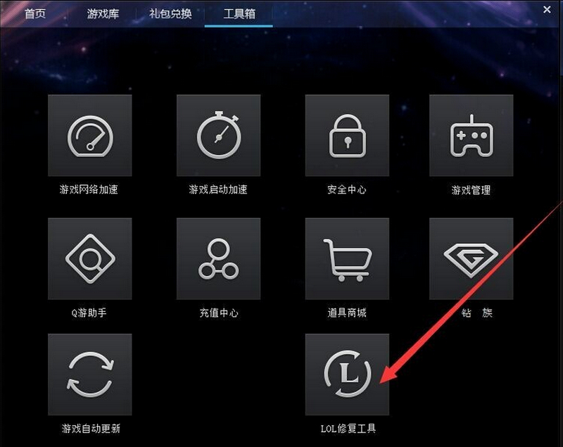 3.點擊左上角的工具箱會看到正下方有一個LOL修復(fù)工具。點擊進(jìn)入。