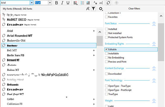 通過(guò)全新的 Embedding Rights 字體過(guò)濾器確保順暢的文件共享,以便根據(jù)四種常見(jiàn)的字體嵌入權(quán)限對(duì)字體進(jìn)行排序,并確定選擇文本樣式時(shí)使用或避免使用哪種字體。使用字體過(guò)濾功能查找特定字體。