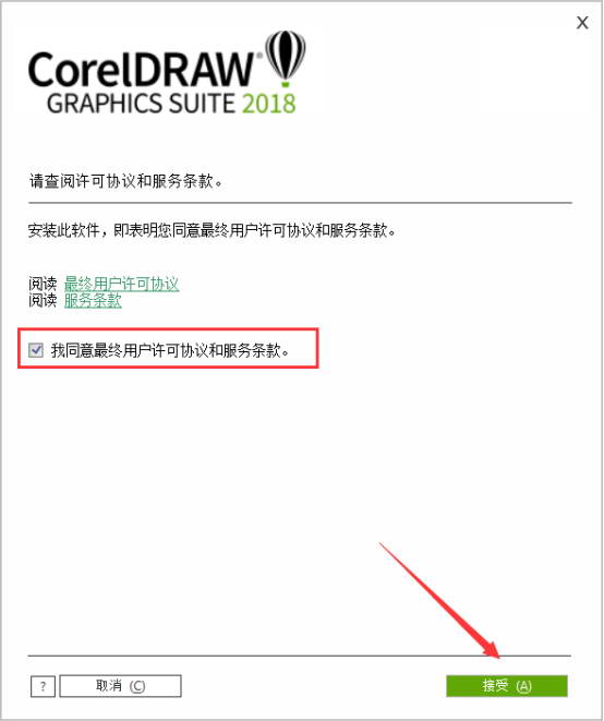 coreldraw2018用戶(hù)安裝許可協(xié)議,勾選我同意協(xié)議,點(diǎn)擊接受。