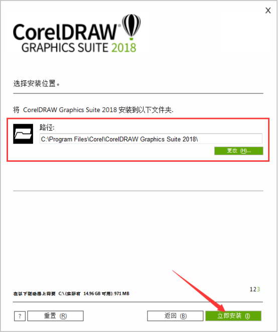 選擇coreldraw2018軟件的安裝路徑,那個(gè)磁盤(pán)空間大就選擇那個(gè),點(diǎn)擊立即安裝。