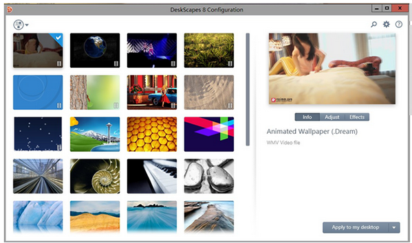 DeskScapes為您提供了動(dòng)畫和自定義您的Windows桌面上的墻紙的功能。 選擇DeskScapes中已包含的動(dòng)畫壁紙之一或使用您自己的圖像、WMV文件來個(gè)性化您的桌面。更加生動(dòng)