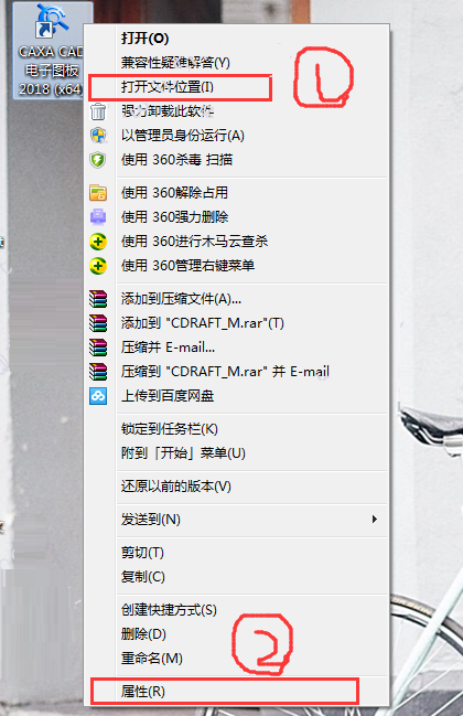 1、成功安裝CAXACAD電子圖板2018后,先不要打開(kāi)該程序,找到CAXACAD電子圖板2018安裝根目錄,如果不記得將CAXA電子圖板2018安裝在什么地方我們可以通過(guò)兩種方法來(lái)找到它①:右鍵點(diǎn)擊桌面上CAXACAD電子圖板2018快捷方式,找到打開(kāi)文件位置的選項(xiàng),點(diǎn)擊即可(注意:此方法只針對(duì)系統(tǒng)中安裝了360安全衛(wèi)士的情況)