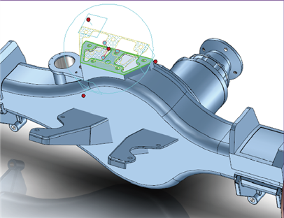 選擇側(cè)蓋,單擊“無(wú)約束裝配”按鈕,選擇側(cè)蓋上一特殊點(diǎn),比如如圖所示的圓中心,然后將鼠標(biāo)移動(dòng)到目標(biāo)零件墊片的對(duì)應(yīng)位置,如果藍(lán)色輪廓顯示的側(cè)蓋位置不合適,可以單擊Tab鍵反向,預(yù)顯位置合適時(shí)單擊左鍵確認(rèn)此次定位。
