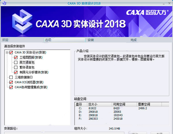 4、選擇安裝組件,包括caxa 3d實(shí)體設(shè)計(jì)、工程圖圖庫(kù),語(yǔ)言包,三維數(shù)據(jù)接口,caxa ics瀏覽器等,建議全部安裝;