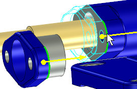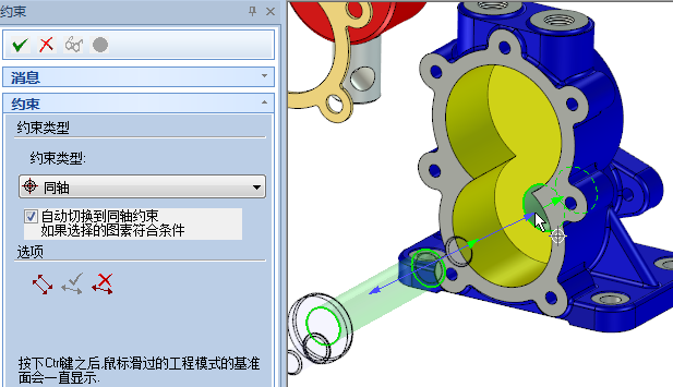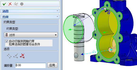單擊“定位約束”按鈕,左鍵選擇柱塞軸,“約束類(lèi)型”自動(dòng)調(diào)整為“同軸”,然后用鼠標(biāo)左鍵選擇圓盤(pán)孔,如圖所示。