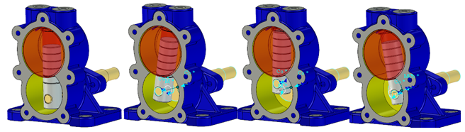5. 依次單擊“智能動(dòng)畫(huà)”功能區(qū)中的“打開(kāi)”、“播放”按鈕,可觀察到曲軸、柱塞和圓盤(pán)的運(yùn)動(dòng)如圖所示。