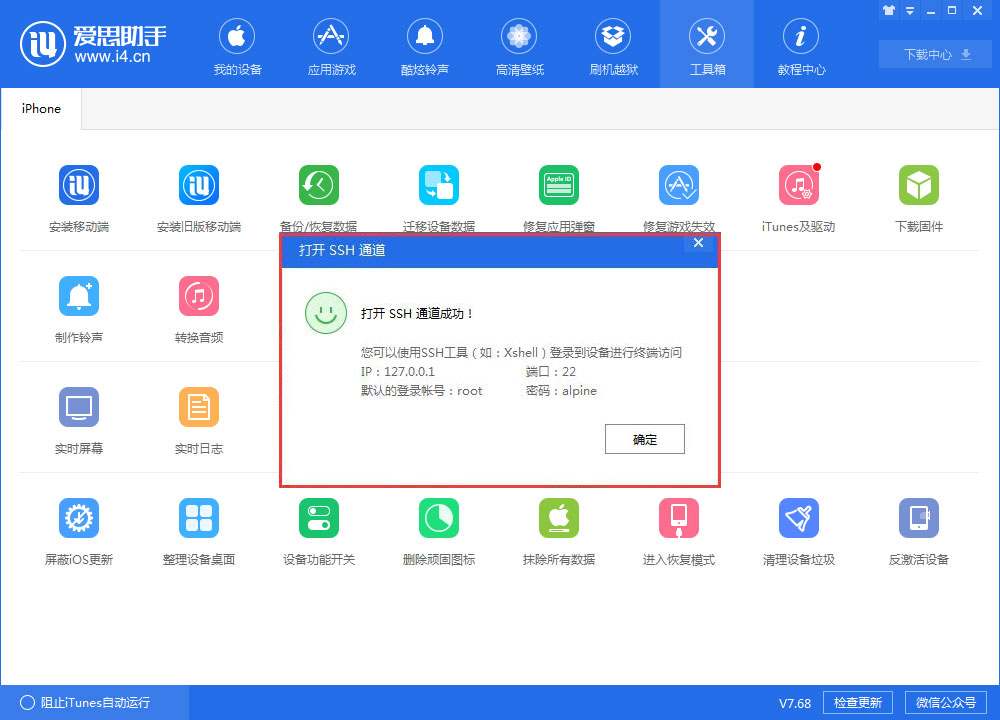 4、再到愛思助手功能工具箱中點擊“打開 SSH 通道”,就可以成功獲取到越獄設(shè)備的遠程登陸IP地址、端口及賬號密碼;