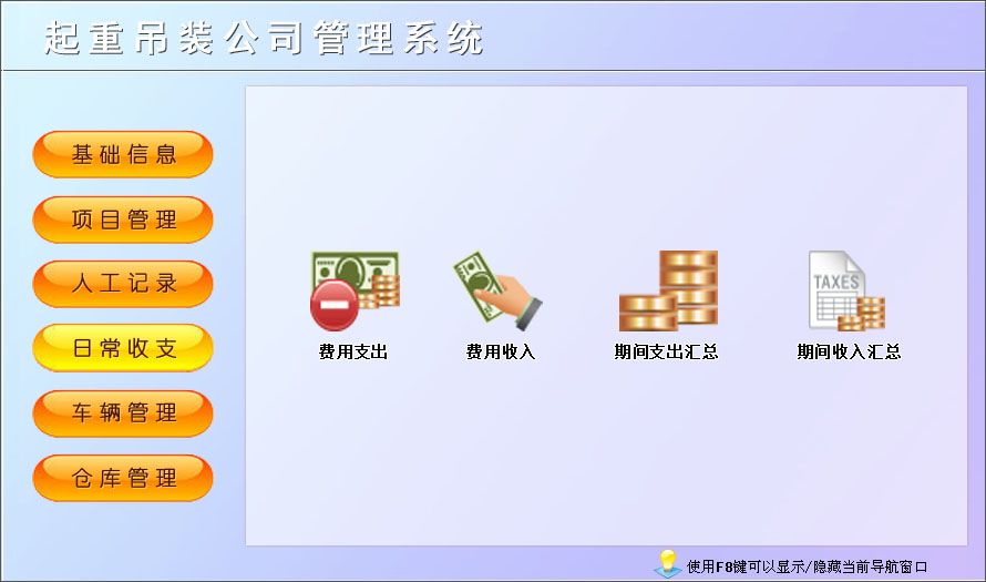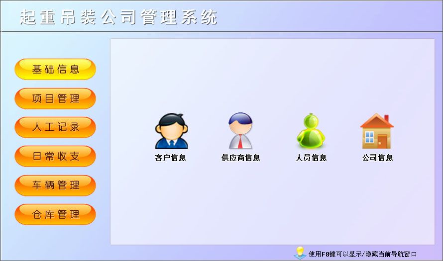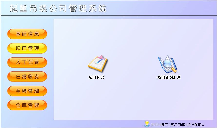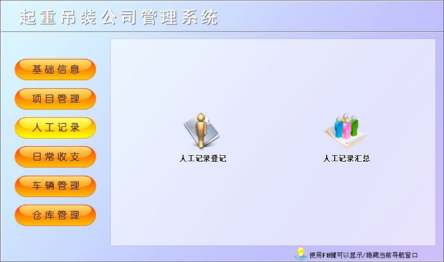 《起重吊裝公司管理系統(tǒng)》適用于中小型起重吊裝公司使用。主要包含基本信息、項目管理、人工記錄、日常收支、車輛管理等功能。本管理系統(tǒng)多處具有快速輔助錄入功能,操作簡單,易學(xué)、易用;處理功能高效強大,是協(xié)助您的好幫手!
