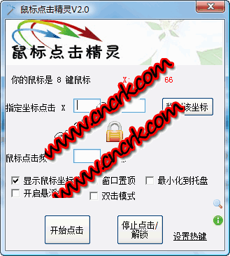 鼠標(biāo)點(diǎn)擊精靈是一款鼠標(biāo)點(diǎn)擊的綠色輔助軟件,用戶可以輕松設(shè)置鼠標(biāo)點(diǎn)擊的頻率,坐標(biāo),點(diǎn)擊模式,并且可以自由設(shè)置熱鍵,窗口模式,懸浮框等,在需要反復(fù)點(diǎn)擊的軟件,游戲的應(yīng)用中,本軟件無(wú)疑是一個(gè)不錯(cuò)的選擇