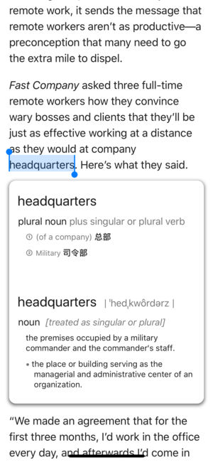 “極光閱讀”的一大特色是“輕點查詞”。在文章頁面,你可輕點一個單詞來快速查看對應(yīng)的單詞釋義。查看完畢時,滑動一下背景即可繼續(xù)閱讀文章。當你閱讀外語文章時,你就能切身感受到它帶給你的高效、輕松的閱讀體驗。