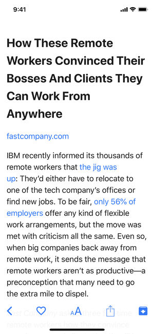 你保存的文章會通過 iCloud 自動備份,并同步到你的所有 iOS 設(shè)備上。因此你可在一臺設(shè)備上保存文章,并于稍后在另一臺設(shè)備上開始閱讀