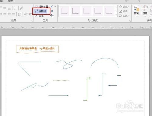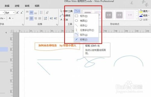 Visio中畫各種線條與箭頭打開Visio文件,我們在功能區(qū)域的最上方會看到很多的功能,在如圖標(biāo)注位置,是手工畫圖區(qū)域,這塊區(qū)域的功能基本上都可以手工操作。