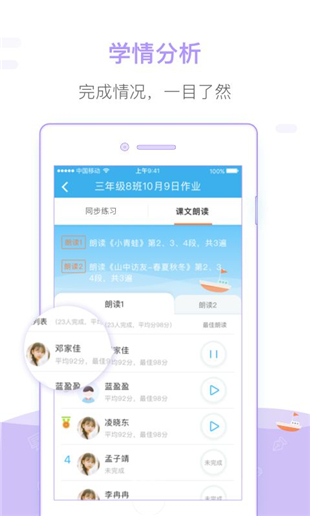 朗讀課文:朗讀課文,自動(dòng)批改海量閱讀:隨時(shí)了解學(xué)生閱讀情況