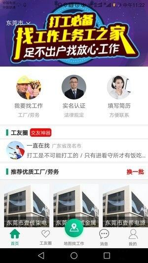 1、務(wù)工之家app可以發(fā)布個人簡歷,身份認證后在地圖上定位附近所有工廠,免去傳統(tǒng)掃街找工作環(huán)節(jié),極大提升了務(wù)工兄弟的選廠上工體驗。2、務(wù)工之家app能夠快速篩選企業(yè)類型查看企業(yè)招聘信息,找到適合自己的好工作。