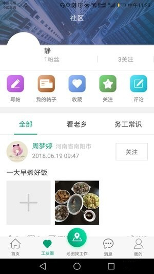 3、在務(wù)工之家app社區(qū)模塊查看附近老鄉(xiāng)動態(tài),了解務(wù)工常識,保護自身權(quán)益。