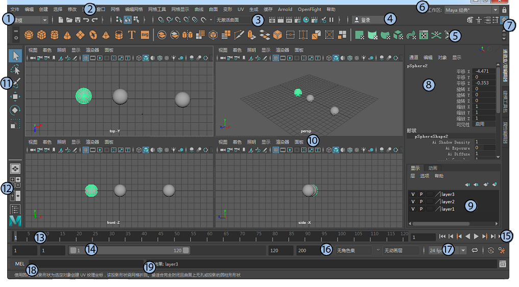 選擇專門設(shè)計(jì)用于不同工作流的窗口和面板的自定義或預(yù)定義排列。此處顯示的是“Maya 經(jīng)典”(Maya Classic)工作區(qū)。