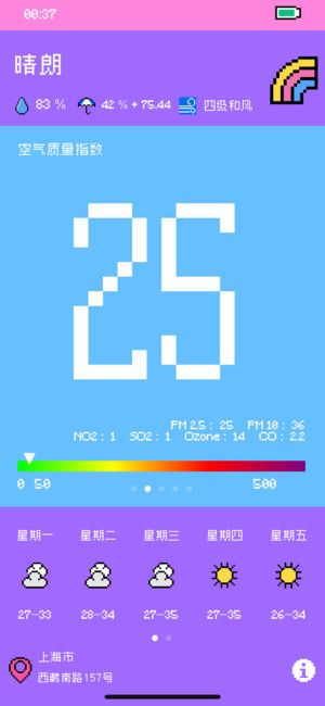 如果你是像素風(fēng)的愛(ài)好者,那么像素天氣一定會(huì)成為你的心頭好。打開(kāi)像素天氣,你會(huì)發(fā)現(xiàn)應(yīng)用從圖標(biāo)到字體都進(jìn)行了像素化處理。