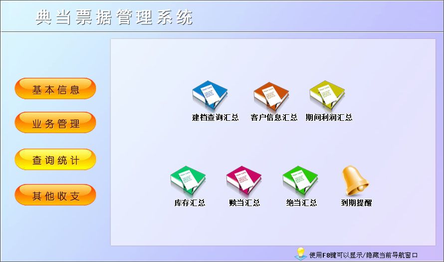 三、查詢統(tǒng)計:建檔查詢匯總、客戶信息匯總、期間利潤匯總、庫存匯總、贖當(dāng)匯總、絕當(dāng)匯總、到期提醒