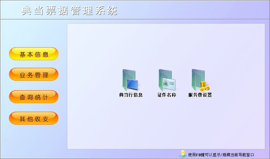 一、基本信息:典當(dāng)行信息、證件名稱、服務(wù)費(fèi)設(shè)置二、業(yè)務(wù)管理:建檔開票、贖當(dāng)、絕當(dāng)