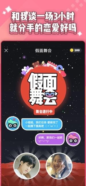 【95后00后的領(lǐng)地,每晚8點(diǎn)邂逅一個(gè)人】假面舞會(huì)是一顆可以讓你相信“緣分”的星球,每晚“20 :00”的鐘聲敲響,你和你的CP便能來(lái)到舞池中央。小星主會(huì)引導(dǎo)陌生的你倆相遇,并且派發(fā)一些有趣的任務(wù)讓你們共同來(lái)完成。雙方可以在假面后放下戒備充分地交流,直到你們?cè)敢鉃閷?duì)方摘下假面。