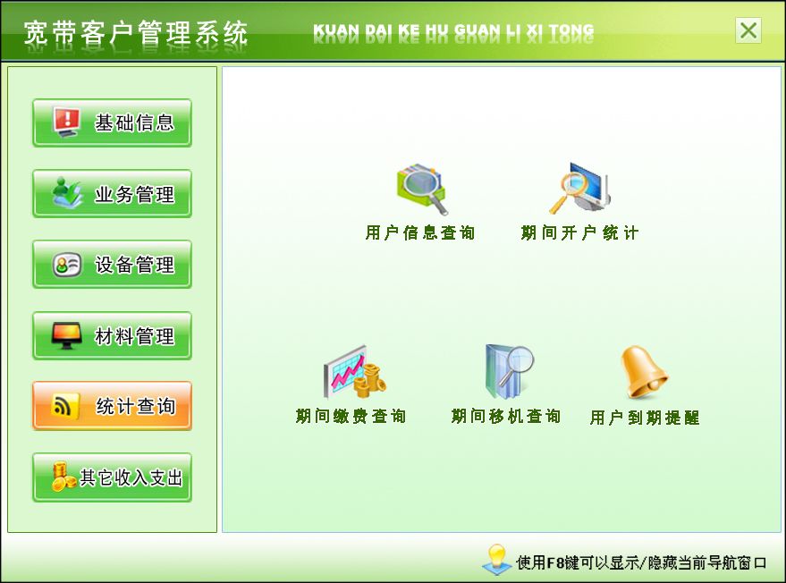 五、統(tǒng)計(jì)查詢:用戶信息查詢、期間開戶統(tǒng)計(jì)、期間繳費(fèi)查詢、期間移機(jī)查詢、用戶到期提醒