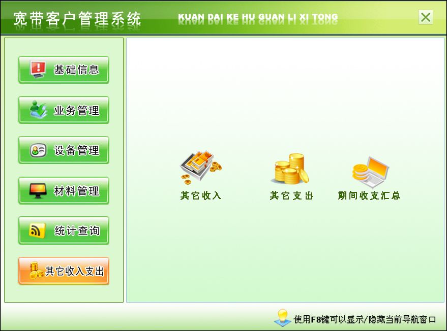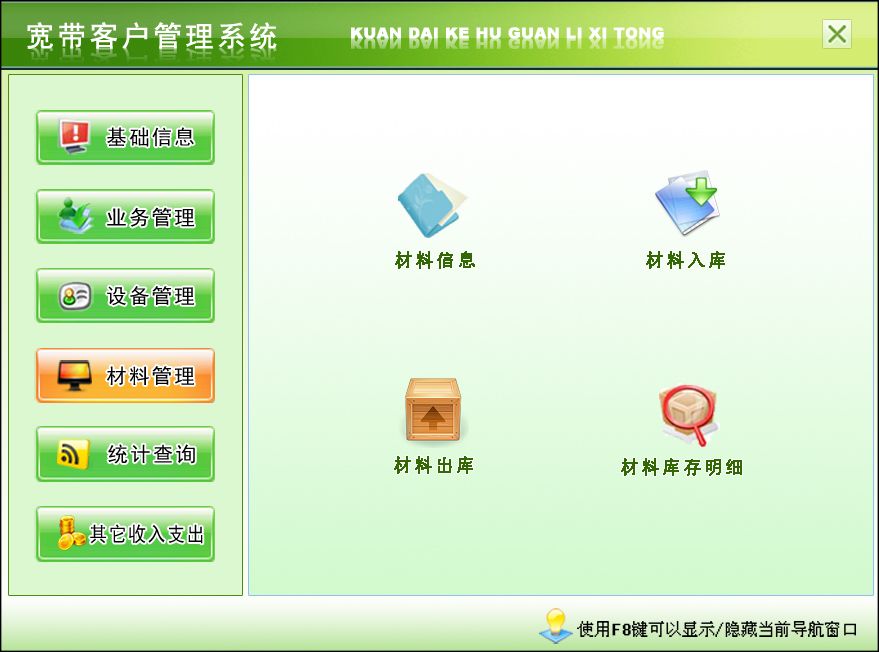 一、基礎(chǔ)信息:人員信息、部門信息、公司信息、小區(qū)資料、套餐類型、供商信息二、業(yè)務(wù)管理:用戶開戶、用戶繳費(fèi)、故障投訴、用戶移機(jī)、用戶過戶、用戶銷戶