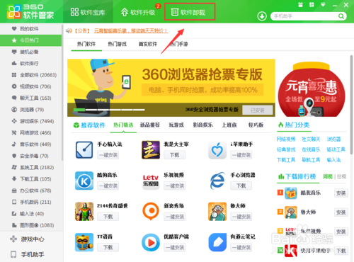 2、然后我們就是打開我們360安全中心的軟件管理,然后我們可以看到我們軟件中心,這里我們所有的軟件都會出現(xiàn)在這里,然后我們在點(diǎn)擊上面的軟件卸載選擇項(xiàng),這里就會出現(xiàn)我們自己的軟件。