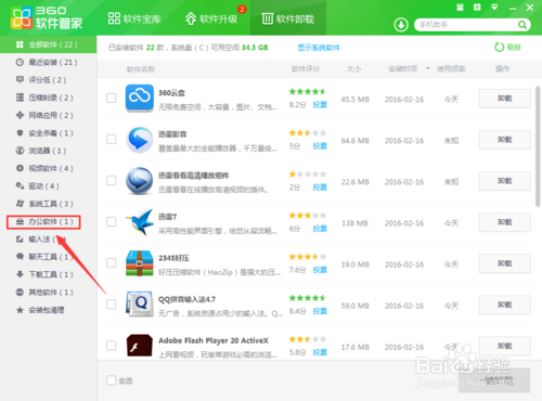 3、然后我們可以在軟件卸載界面看不到我們的office2016這個軟件的,這里我們就是需要點(diǎn)擊最左邊的辦公軟件。