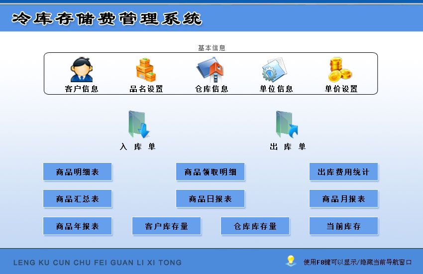 《冷庫(kù)存儲(chǔ)費(fèi)管理系統(tǒng)》是根據(jù)冷庫(kù)存儲(chǔ)的管理進(jìn)行開發(fā)的一款軟件,該軟件操作簡(jiǎn)單,界面簡(jiǎn)潔。區(qū)別于其他同類軟件的主要特點(diǎn)是:入庫(kù)時(shí)定義存儲(chǔ)單價(jià),出庫(kù)時(shí)結(jié)算存儲(chǔ)費(fèi)。軟件主要功能包括:商品管理:入庫(kù)單、出庫(kù)單、商品明細(xì)表、商品領(lǐng)取明細(xì)和出庫(kù)費(fèi)用統(tǒng)計(jì)。數(shù)據(jù)統(tǒng)計(jì):商品匯總表、商品日?qǐng)?bào)表、商品月報(bào)表、商品年報(bào)表、客戶庫(kù)存量、倉(cāng)庫(kù)庫(kù)存量和當(dāng)前庫(kù)存?;拘畔ⅲ嚎蛻粜畔?、品名設(shè)置、倉(cāng)庫(kù)信息、單位信息和單價(jià)設(shè)置。本軟件可以查看實(shí)時(shí)的庫(kù)存情況及庫(kù)存物品所產(chǎn)生的費(fèi)用。